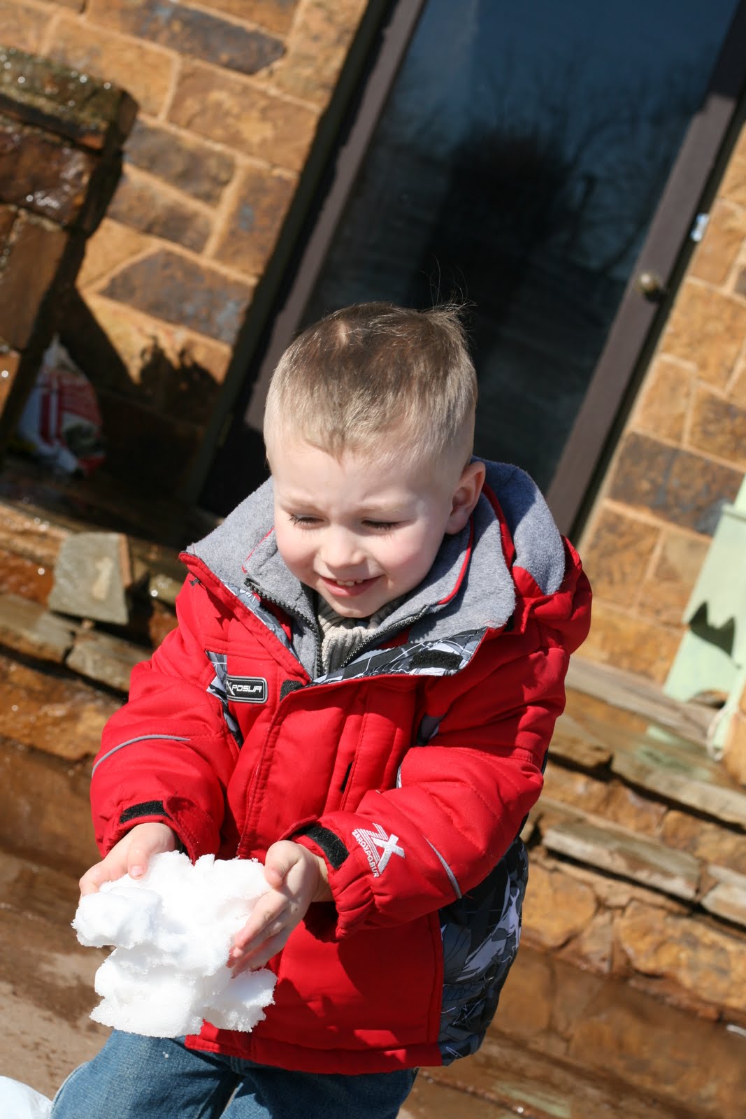 It seems odd to be posting pictures of snow play just days after posting pictures of my kids outside in shorts and t-shirts, but that is totally Oklahoma for you. I have heard a lot of people describe their state's weather as bi-polar, but seriously if you have never lived in Oklahoma you have no idea. 72 to 9 to 54...yeah it's crazy. I always have to have a pair of shorts in my kids drawers, even in the dead of winter, and vice versa. Anyway, a couple days after our beautiful weather, we got one of the biggest blizzards I have ever seen in Oklahoma. It dumped an incredible amount of snow on us, but thankfully no ice! The temperatures were way cold, so we didn't leave the house for a couple of days. The kids kept wanting to play in the snow, but with temperatures in the negatives, there was just no way. Finally, yesterday, it warmed up back into the 50s and melted a ton of the snow, but because we got so much there was still plenty to play in. We went outside and built a snowman and did all the traditional snow playing. The kids had a blast! And don't mind our ghetto "snow boots". We hadn't bothered to buy snow boots this year, lucky for Lyna she had a hand me down pair, but the boys weren't so lucky, but hey their plastic bags over tennis shoes worked great!
